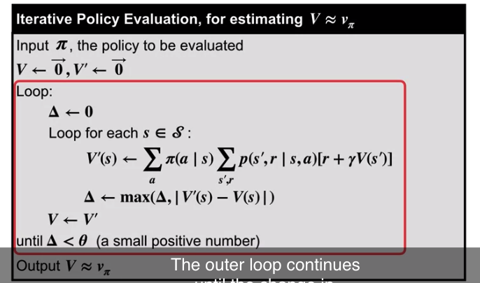 First we consider how to compute the state-value function \(v_\pi\) for an arbitrary policy \(\pi\). This is called policy evaluation in the DP literature. We also refer to it as the prediction problem.